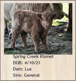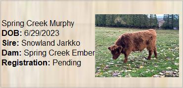 Spring Creek Delta was an early surprise born in November 2015. She wasn't expected until February 2016. Her dam is Spring Creek Georgia. Her sire is Skye High Capone from whom we expect many more beautiful calves.